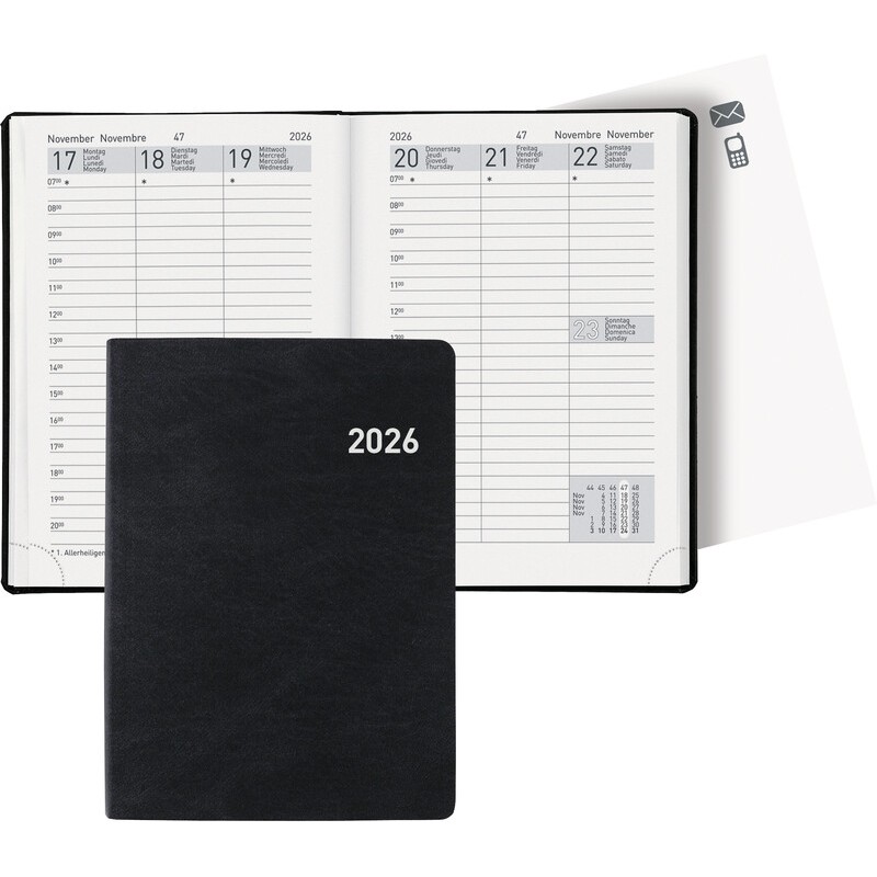 Agenda de poche BIELLA Rex 1 semaine sur 2 pages, calendrier en 4 langues all./fr./it./angl., ligné travers, division horaire (07.00 - 20.00 heures), pages annuelles et mensuelles supplémentaires, pages de notes perforées, double page avec calendrier mensuel, répertoire d'adresses interchangeable, coins perforés, format 10,1 x 14,2 cm. Durabilité eco:plus: Certification: FSC. couverture en similicuir, marbré en couleur noir