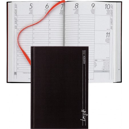 Agenda de poche BIELLA LONGATTI 1 semaine sur 2 pages, couverture en similicuir, calendrier en 4 langues all./fr./it./angl., ligné travers, division horaire (07.00 - 19.00 heures), pages annuelles et mensuelles supplémentaires, pages de notes, double page avec calendrier mensuel et espace pour notes, répertoire d'adresses, signet, format: 10,4 x 14,8 cm. noir