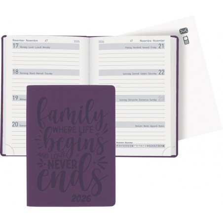 Agenda de poche BIELLA Memento Ladytimer 1 semaine sur 2 pages, couverture en PU avec gaufrage à sec, calendrier en 4 langues all./fr./it./angl., ligné travers, pages annuelles et mensuelles supplémentaires, pages de notes perforées, double page avec calendrier mensuel et espace pour notes, répertoire d'adresses interchangeable, coins perforés, format: 10,1 x 14,2 cm. Durabilité eco:plus: Certification: FSC. violet