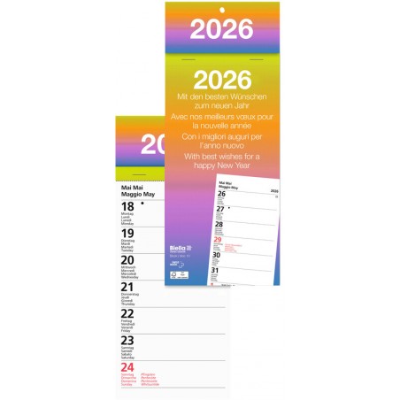 Calendrier à effeuiller BIELLA Semaine 1 semaine par feuille, en papier, blanc, calendrier en 4 langues all./fr./it./angl., espace pour notes, trou de suspension, agrafé sur fond en carton, format: 10,5 x 21 cm. Durabilité eco:plus: Certification: FSC. bloc 10 calendrier 10,5 x 21 cm