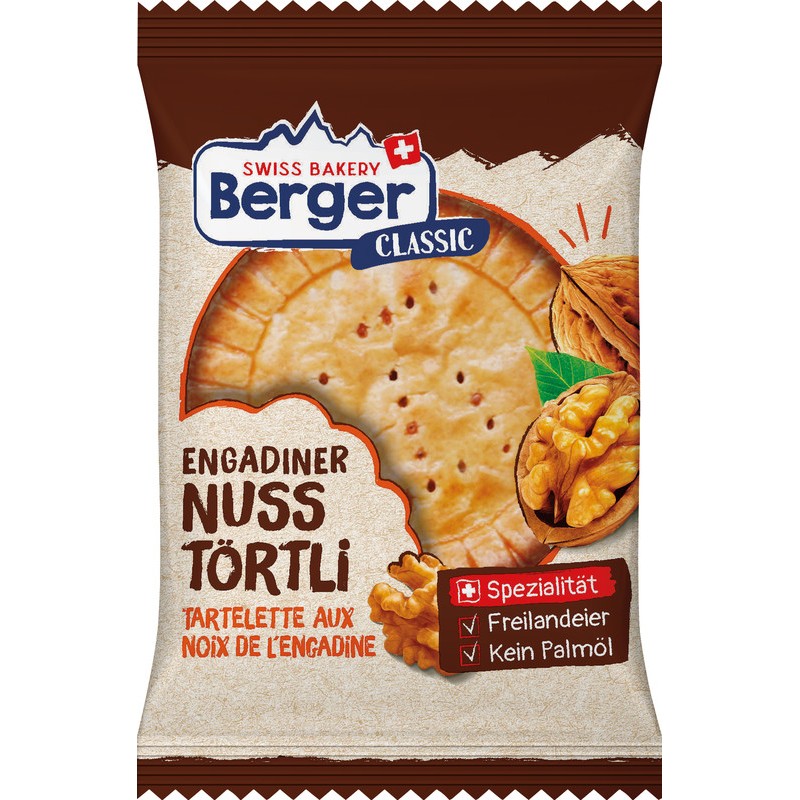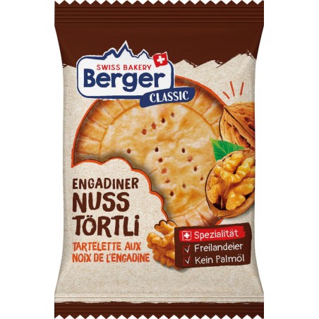 Gâteaux secs BERGER tartelette aux noix spécialité de pâtisserie traditionnelle des Grisons, fourrée aux noix, recouverte de caramel et de miel.
