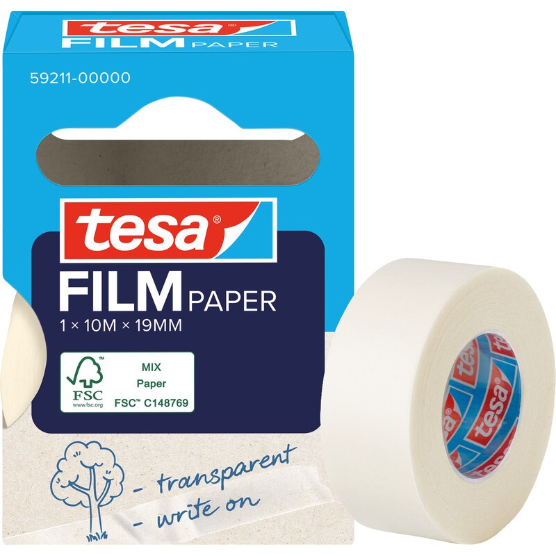 Ruban adhésif TESA® Film paper film support contenant 55% de matières premières renouvelables, qualité transparente, inscriptible, fort pouvoir adhésif, sans solvant, découpe aisée à la main.