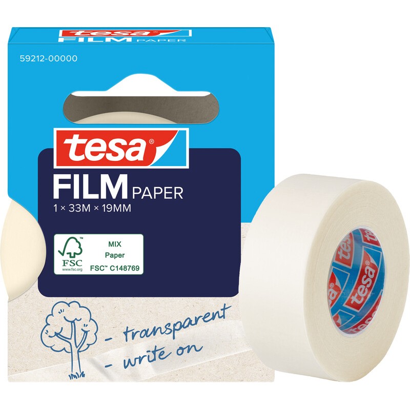 Ruban adhésif TESA® Film paper film support contenant 55% de matières premières renouvelables, qualité transparente, inscriptible, fort pouvoir adhésif, sans solvant, découpe aisée à la main.