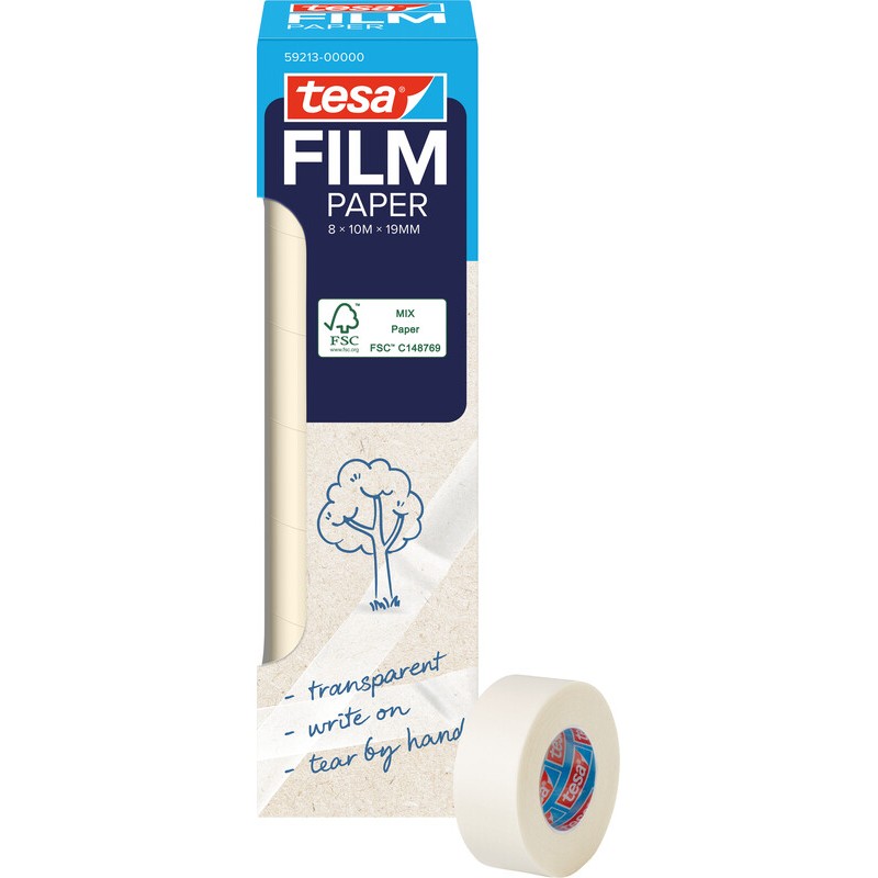Ruban adhésif TESA® Film paper film support contenant 55% de matières premières renouvelables, qualité transparente, inscriptible, fort pouvoir adhésif, sans solvant, découpe aisée à la main.