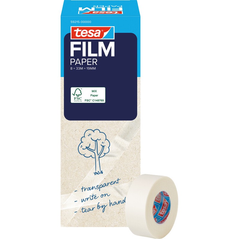 Ruban adhésif TESA® Film paper film support contenant 55% de matières premières renouvelables, qualité transparente, inscriptible, fort pouvoir adhésif, sans solvant, découpe aisée à la main.