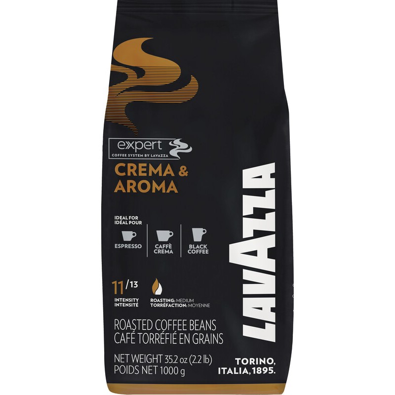 Café en grains LAVAZZA Expert pour machines à expresso à piston et machines automatiques. Sachet de 1 kg. Crema & Aroma un mélange d'arabica de grain de café et de robusta, torréfaction moyenne, avec un arôme de chocolat noir et d'épices.