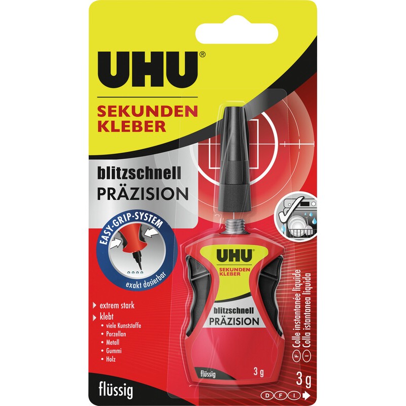 Colle instantanée ultrarapide UHU® Précision liquide ultrarapide et extra forte, colle presque tous les matériaux souples et rigides tels que le bois, la porcelaine, le métal, la céramique, le cuir, le caoutchouc, le liège, les textiles, le plastique, etc., dosage précis grâce à une technique éprouvée, ne coule pas, pour toutes les réparations précises et rapides à la maison, au bureau, à l'atelier, pour le modélisme et le bricolage.