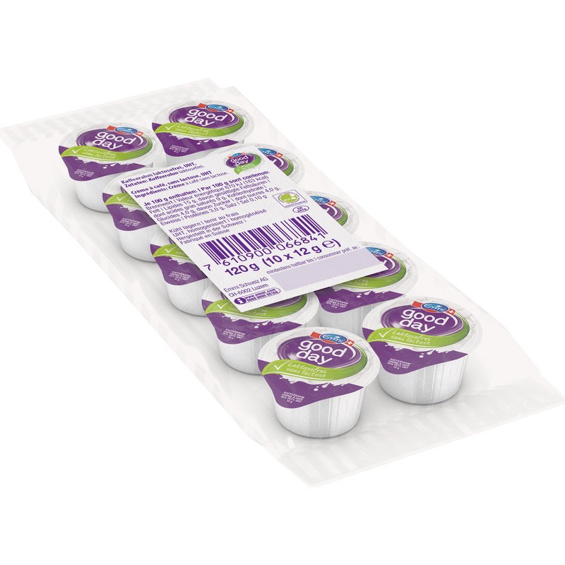 Crème à café en portions EMMI UHT good day sans lactose, 15% de matière grasse, contenu 12 g. Emballage de 10 pièces.