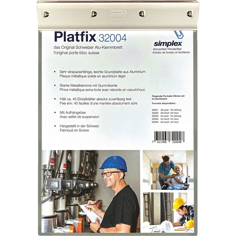 Plaque à pince SIMPLEX Platfix en aluminium anodisé incolore, coins arrondis, avec pince large fixée sur la plaque. pince sur le côté court