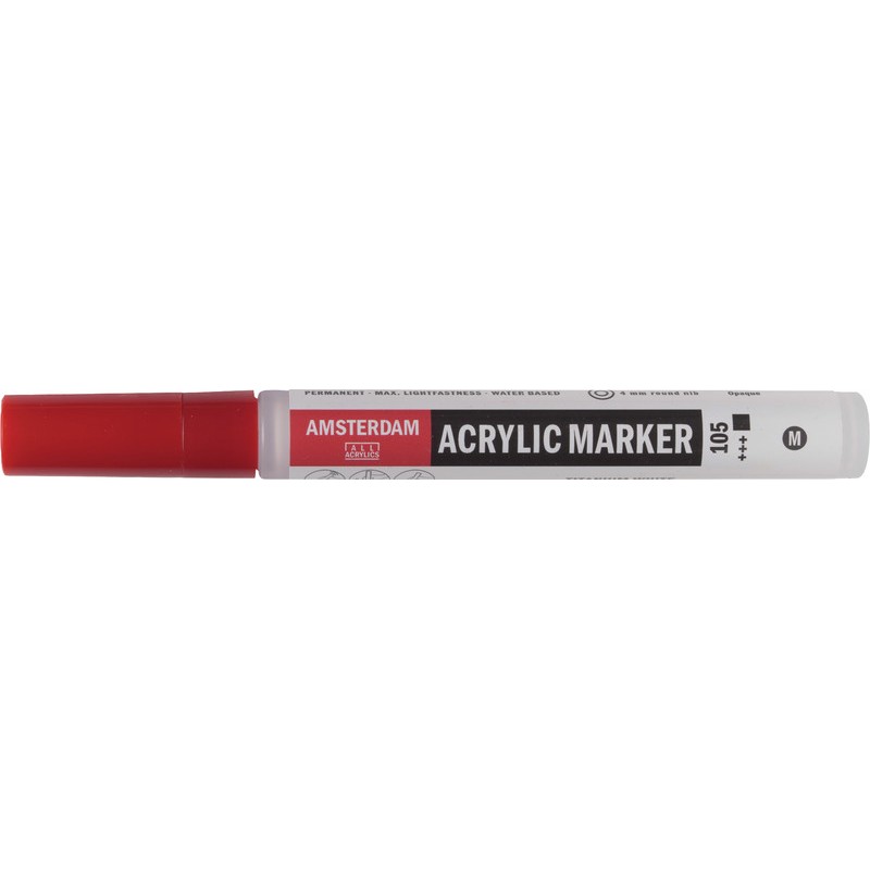 Marqueur acrylique AMSTERDAM pointe ogive, couleur brillante à base d'eau, très grande résistance à la lumière, parfait pour esquisser, peindre ou écrire sur un grand nombre de supports acryliques, p. ex. sur les châssis entoilés, le bois ou la terre cuite, séchage rapide, résistant à l'eau après séchage, non rechargeable, largeur de trait env. 4 mm.