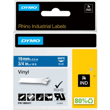 Ruban DYMO® Rhino(TM) IND pour DYMO® Rhino(TM) 3000, 4200, 5000, 5200, 6000, M1011, XTL-300, XTL-500 et Rhinopro 5000. en vinyle, longueur 5,5 m résiste aux températures de -40 à +80°C.