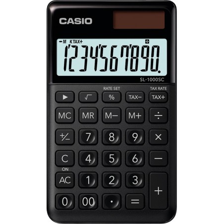 Calculatrice de poche CASIO® SL-1000SC avec affichage LCD de 10 chiffres, touches pourcentage, racine carrée, calcul des taxes, 4 touches mémoire, changement de signe, touches 00 et correction rapide, fonction arrêt automatique, design ergonomique des touches. Alimentation: solaire et piles. Dimensions: L 71 x H 9 x P 120 mm. Poids: 55 g. Prix incluant la TAR.