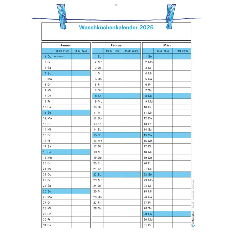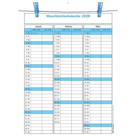 Calendrier buanderie GULER 3 mois par feuille, calendrier en allemand, avec division demi-journalière (06.00 - 14.00 heures) et (14.00 - 22.00 heures), dimanche et jours fériés mis en évidence optiquement, 400 g/m2, anse de suspension, format: A4. Durabilité eco:plus: construit pour être démontable, recyclable, teneur en déchets recyclés après utilisation max. 100%, réduction des déchets, emballage respectueux de l'environnement.