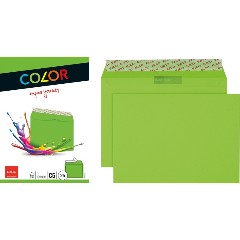 Enveloppes ELCO Color, petit emballage en couleur, sans chlore élémentaire. Durabilité eco:plus: recyclable. Certification: FSC. C5, avec fermeture autoadhésive Optifix®, par couleur 229 x 162 mm, façon DNG-HK. Cello-zip de 25 pièces.
