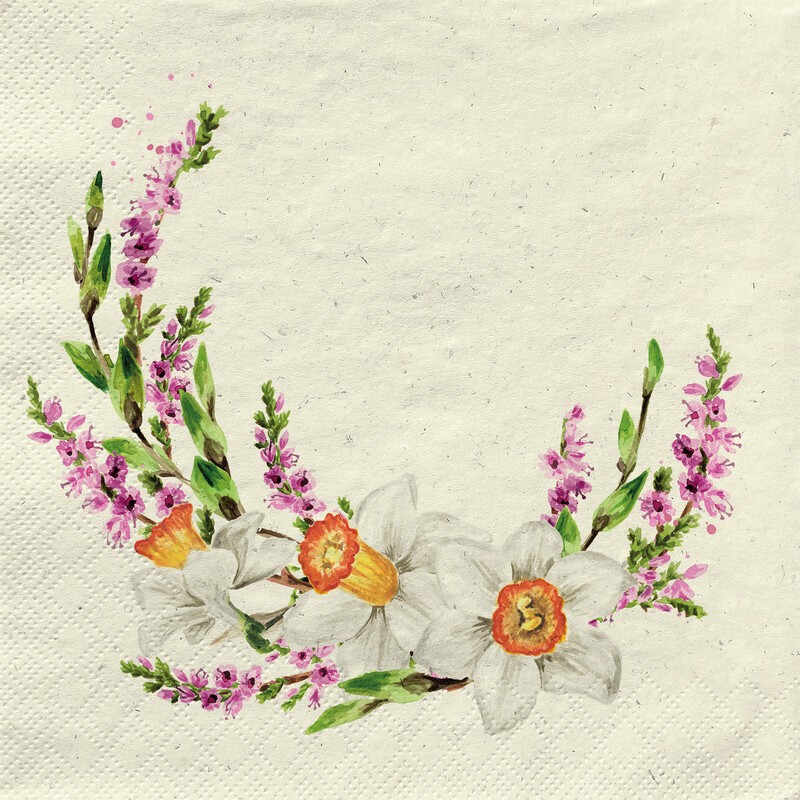 Serviettes FASANA magic moments Printemps 3 couches, pliage 1/4. Emballage de 20 pièces. Durabilité eco:plus: compostable, dégradable, énergie récupérée. Certification: FSC, Nordic Ecolabel. en ouate de cellulose en herbe, format: 330 x 330 mm
