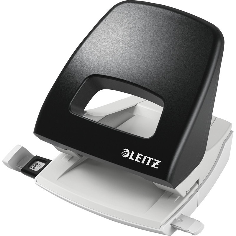 Perforateur LEITZ® série NeXXt 5005 partie inférieure en métal, poignée en ABS avec étrier en métal, pour écartement 8 cm, perforation Ø 5,5 mm, réglette avec indications du format facilement lisibles et fenêtre de visualisation du format réglé en couleur, poinçons extrêmement bien affûtés, zone de préhension prémoulée brevetée pour une perforation sans effort, capacité de perforation 2,5 mm (25 feuilles). Garantie: 10 ans. Certification: GS.