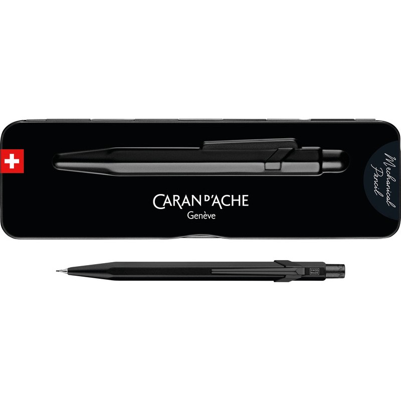 Portemine CARAN D'ACHE 849(TM) Premium Black Code corps en aluminium satinés, bouton-pression et clip chromés, avec conduit fixe, gomme, pour mines 0,7 mm, avec étui en métal.