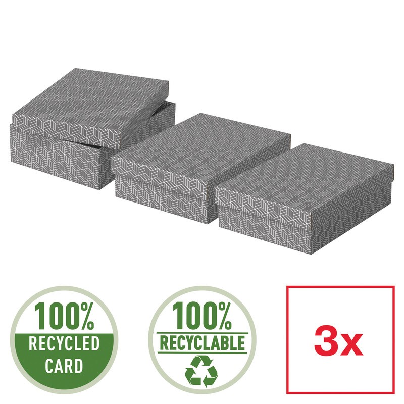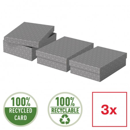 Boîtes d'archives ESSELTE® en carton ondulé recyclé 100%, design robuste et élégant, couvercle amovible, livrées à plat, à monter soi-même, surface revêtue et essuyable. Emballage de 3 pièces. Durabilité eco:plus: recyclable, composant recyclé. Certification: FSC. Medium