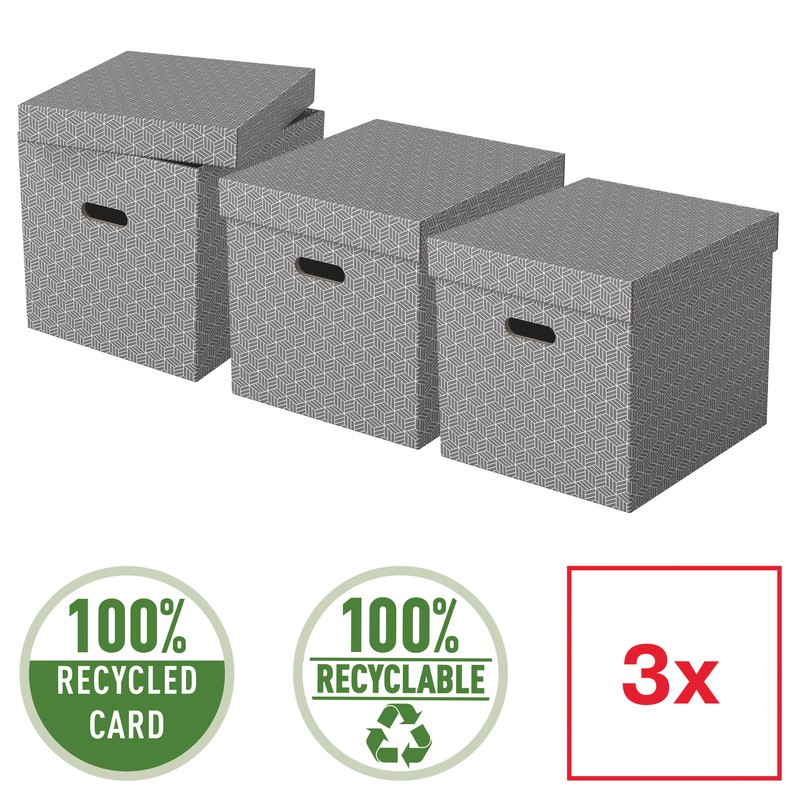 Boîtes d'archives ESSELTE® en carton ondulé recyclé 100%, design robuste et élégant, couvercle amovible, livrées à plat, à monter soi-même, surface revêtue et essuyable. Emballage de 3 pièces. Durabilité eco:plus: recyclable, composant recyclé. Certification: FSC. Cube avec poignées