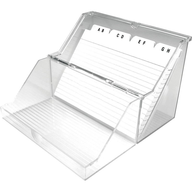 Fichier avec couvercle HELIT the index en PS. Durabilité eco:plus: durée de vie du produit prolongée, recyclable, teneur en déchets recyclés après utilisation max. 100%, réduction des déchets, emballage respectueux de l'environnement. pour format A8 oblong livré avec jeu de cartes-guides A - Z et 50 cartes-fiches lignées, capacité max. 200 cartes-fiches. Dimensions extérieures: L 85 x H 72 x P 60 mm.