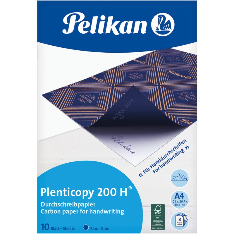 Papier carbone pour écrire à la main PELIKAN Plenticopy 200 H® bleu, pour un très grand nombre de copies, couche à base de cire sur support papier pour un rendu élevé de la couleur, format 210 x 297 mm. Boîte de 10 feuilles.