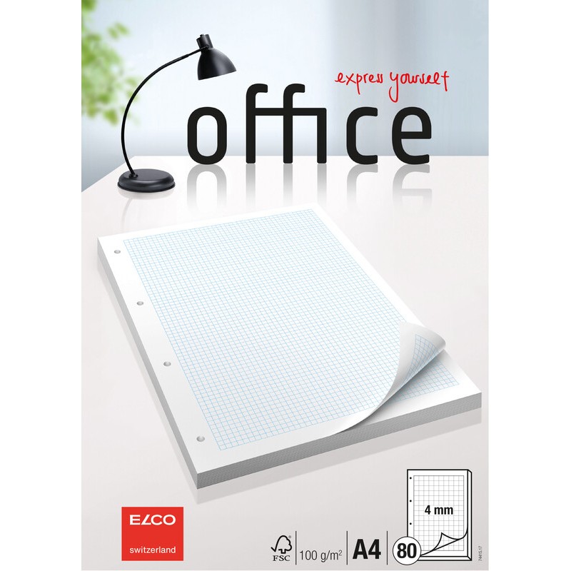 Bloc de feuilles perforées pour couvertures à anneaux ELCO Office papier extra-blanc, satiné, 100 g/m2, 80 feuilles, avec cadre, 4 trous, format A4. Durabilité eco:plus: recyclable. Certification: FSC.