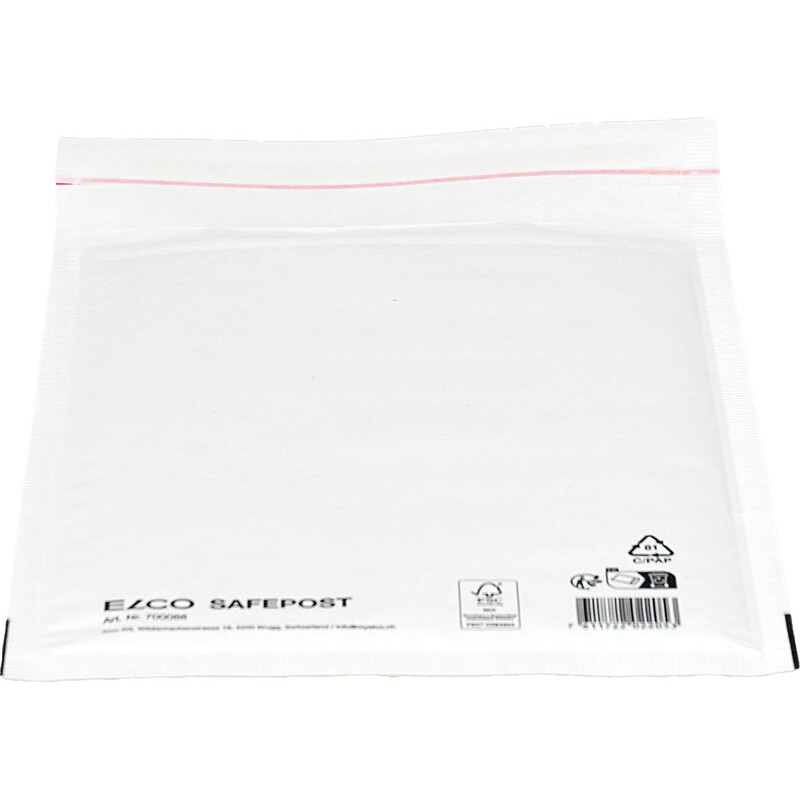 Pochette matelassée de bulles ELCO Safepost en papier et plastique, pochette d'expédition blanche avec sachet bulles pour l'expédition d'objets fragiles, système bag-in-bag avec pochette intérieure en plastique, amovible, pochette extérieure en papier, avec fermeture adhésive. Durabilité eco:plus: construit pour être démontable, recyclable. Certification: FSC.