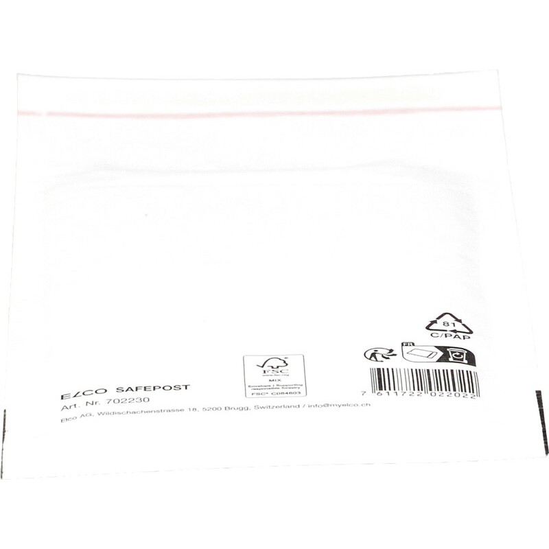 Pochette matelassée de bulles ELCO Safepost en papier et plastique, pochette d'expédition blanche avec sachet bulles pour l'expédition d'objets fragiles, système bag-in-bag avec pochette intérieure en plastique, amovible, pochette extérieure en papier, avec fermeture adhésive. Durabilité eco:plus: construit pour être démontable, recyclable. Certification: FSC.