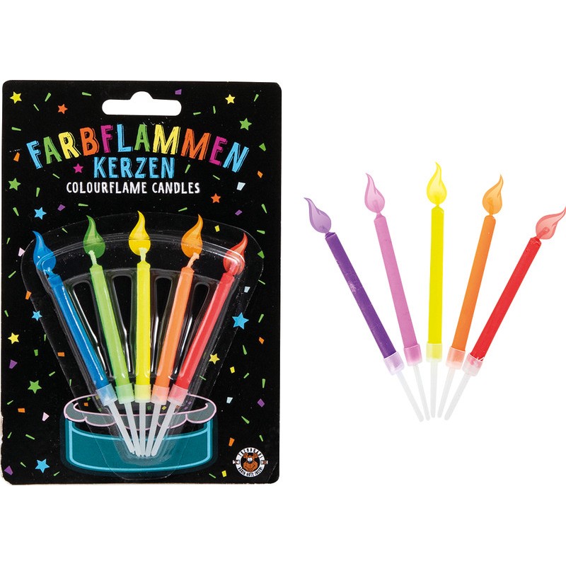 Bougies d'anniversaire TRENDHAUS® Birthday Fun les bougies brûlent pendant environ neuf minutes, couleurs assorties, bleu, vert, jaune, orange et rose ou violet, rose vif, jaune, orange et rouge. Blister de 5 bougies.
