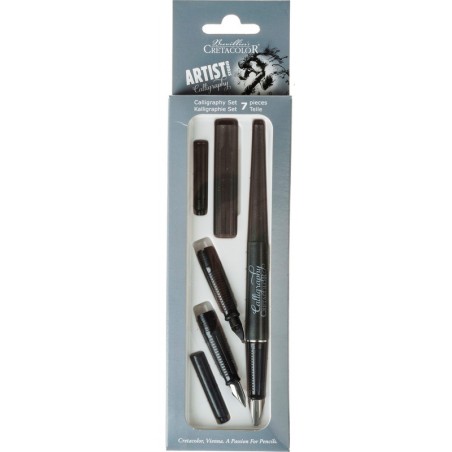 Calligraphy Set CRETACOLOR® avec plume à large bec, pour la calligraphie classique, corps et capuchon en plastique, plume en acier fin, convient aux droitiers et aux gauchers. Set de 1 stylo plume calligraphique, 1 pointe avec des largeurs de trait de 1,1 mm, 1,5 mm et 2,3 mm et 3 cartouches d'encre.