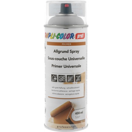 Sous-couche universelle DUPLI-COLOR PROFI® apprêt universel, à base de résines synthétiques, très bonne adhérence, sèche rapidement, sec et recouvrable avec env. 3 - 4 h, nitro-résistant après séchage à coeur, utilisable à l'intérieur comme à l'extérieur, convient pour le fer, l'acier, le zinc, l'aluminium, l'aluminium anodisé, l'acier V2A, les éléments de construction revêtus par poudrage, différents plastiques et le bois, protection active contre la corrosion, résistant aux intempéries. Bombe 400 ml.