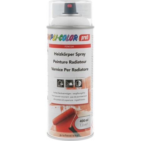 Peinture radiateur DUPLI-COLOR PROFI® pouvoir couvrant élevé, résultat de couleur intense et régulier, hautement pigmenté, qualité acrylique, sèche extrêmement rapidement, résistant à la poussière après env. 10 min., résistant au toucher après 30 min., résistant à la température jusqu'à 80°C, utilisable pour des surfaces plus grandes grâce à la pulvérisation professionnelle, idéal pour une utilisation mobile. Bombe 400 ml.