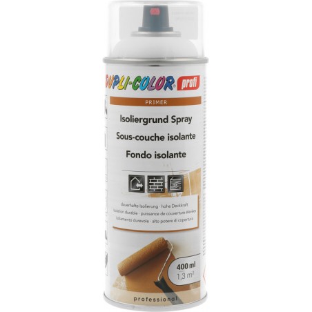 Sous-couche isolante DUPLI-COLOR PROFI® effet isolant et barrière contre de nombreux types de taches, à base de résines synthétiques, sec et recouvrable après env. 60 min., ne convient pas pour les vernis à deux composants, pour l'intérieur et l'extérieur, convient pour le plâtre, le bois et le béton. Bombe 400 ml.
