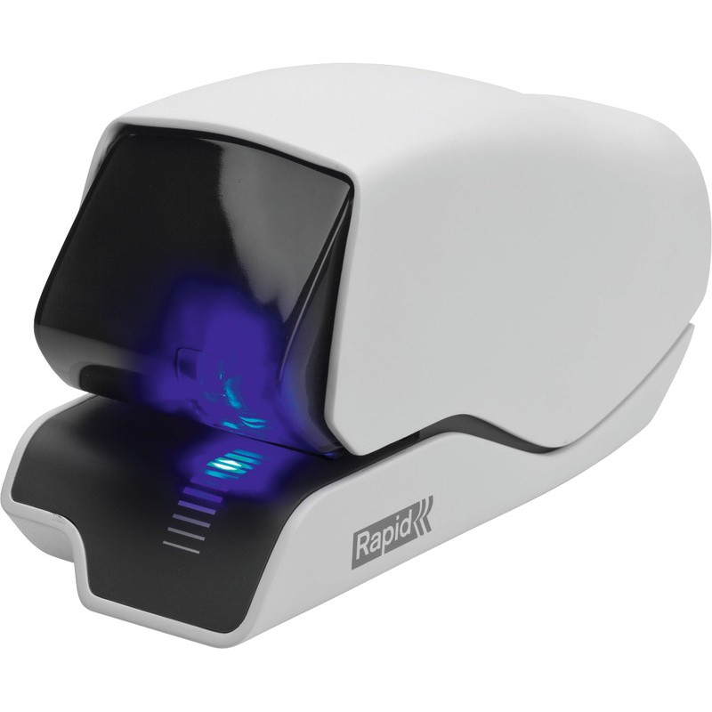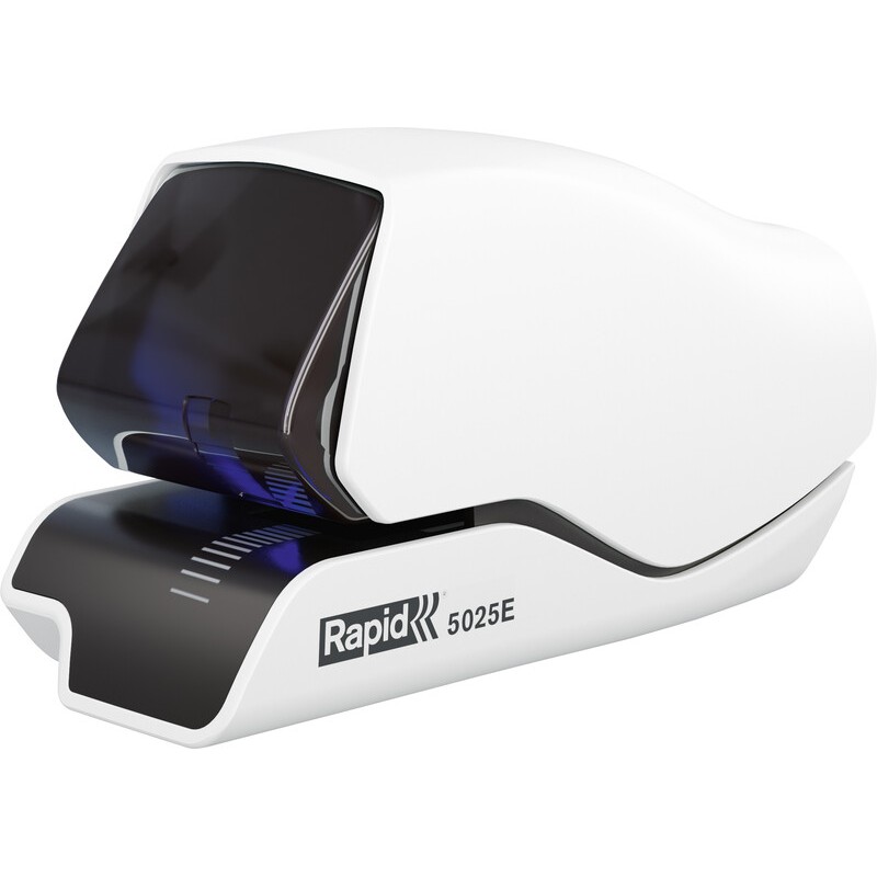 Agrafeuse électrique RAPID® 5025e en métal et plastique, utilisation à une main, l'agrafage à plat réduit la hauteur des piles de papier de 30%, technologie d'agrafage à cassettes: les pièces usées sont remplacées avec chaque nouvelle cassette, système de guidage à LED, capacité d'agrafage env. 2,5 mm (25 feuilles). Agrafes: cassette d'agrafes 5025e. Livrée avec adaptateur secteur et une cassette d'agrafes (1500 agrafes). Prix incluant la TAR.