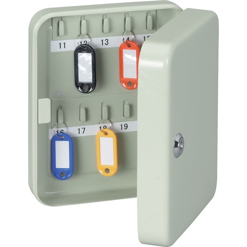 Armoire à clés MAUL en acier thermolaqué, grise, cylindre de sécurité, 2 clés, avec porte-clés, matériel de fixation et autocollants de numérotation. sans volet de séparation