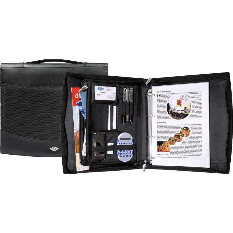 Serviette classeur WEDO® Elégance combinaison de similicuir de haute qualité et de nylon structuré, avec zip, adaptée aux gauchers et aux droitiers grâce à la possibilité d'insérer le bloc des deux côtés, sans bloc-notes, mécanisme à 4 anneaux amovible (Ø 35 mm, capacité 24 mm), poignée de portage, compartiment zippé, 3 languettes porte-stylo, 3 compartiments pour cartes, 3 languettes élastiques de tailles différentes, pour format A4. Dimensions: L 360 x H 315 x P 60 mm.