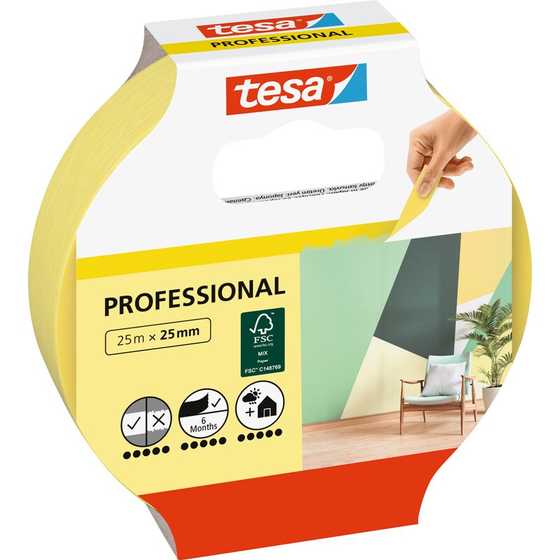Ruban de masquage en papier crêpe TESA® Precision Indoor adapté aux travaux de peinture à l'intérieur, extra mince, indéchirable, pour des contours très précis, adhère sur toutes les surfaces lisses, s'enlève sans laisser de traces jusqu'à 5 mois, convient pour tout type de peintures, sans solvant et composé majoritairement de matières premières renouvelables.
