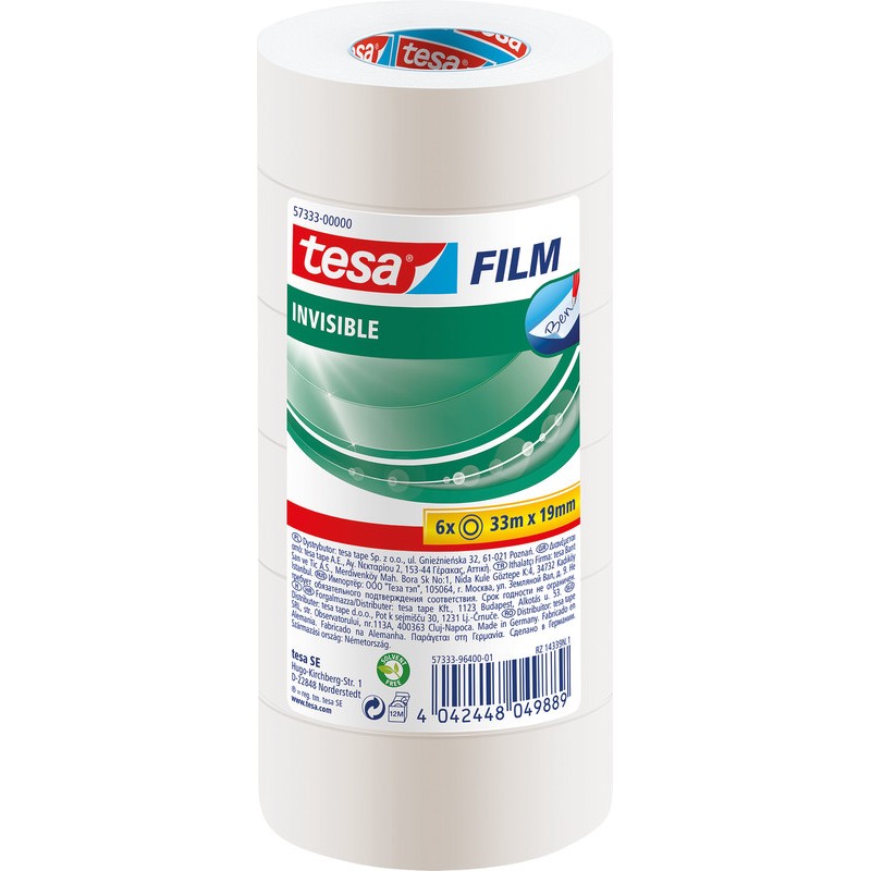 Ruban adhésif TESA® Film invisible invisible sur le papier blanc et les surfaces mates, inscriptible avec pratiquement tous les instruments d'écriture, déroulement en douceur et silencieux, indétectable sur les photocopies, résistance élevée au vieillissement, film PP et masse adhésive sans solvant.