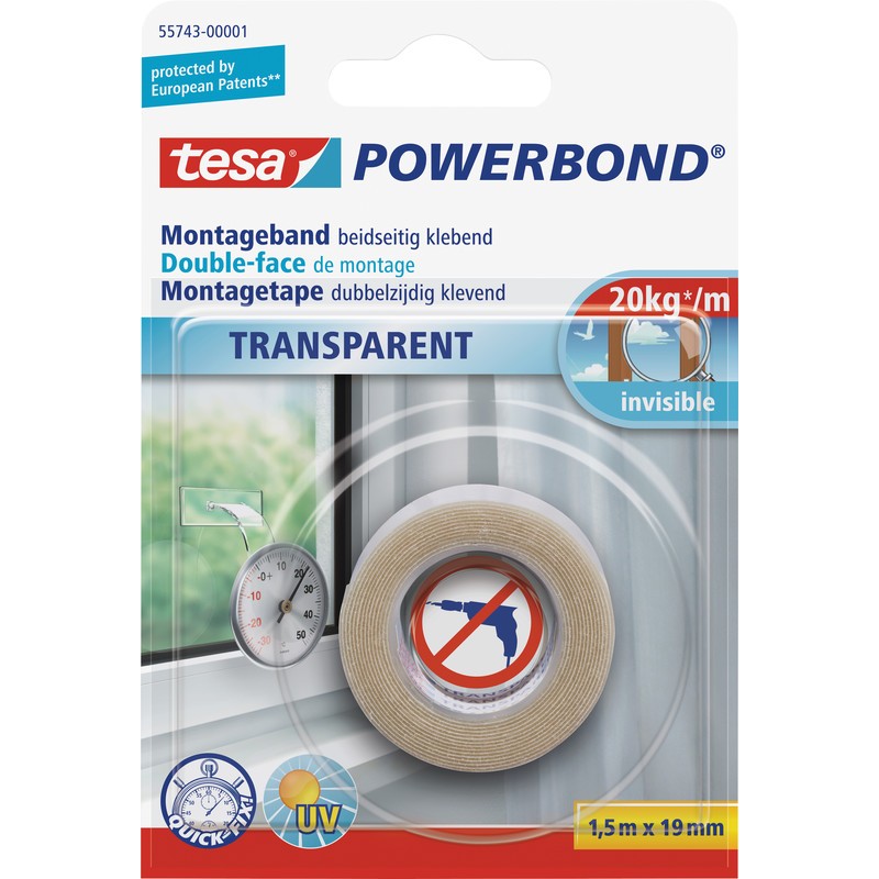 Ruban de montage TESA® Powerbond® transparent extra-fin et transparent pour un collage invisible d'objets transparents, ruban adhésif double face, adhère au verre, au carrelage, au plâtre, au bois et à la plupart des matières plastiques, maintient jusqu'à 2 kg par 10 cm de ruban.