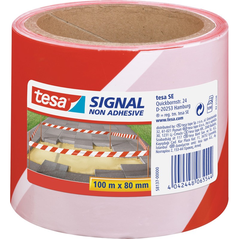 Ruban de délimitation TESA® Signal en film PE, non adhésif, imprimé des deux côtés, résistant à l'abrasion, résistant aux UV pendant 3 mois.