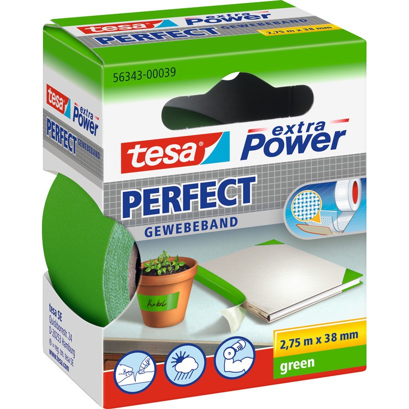 Ruban toilé TESA® extra Power Perfect toile en ouate de cellulose plastifiée, adhésive, pour les travaux manuels, la fixation, la réparation, le cerclage, le renfort, le marquage, etc., résultats propres et professionnels, résistance élevée aux intempéries, pour des applications intérieures et extérieures, résistante à la déchirure, mais se découpe à la main, inscriptible. 38 mm x 2,75 m