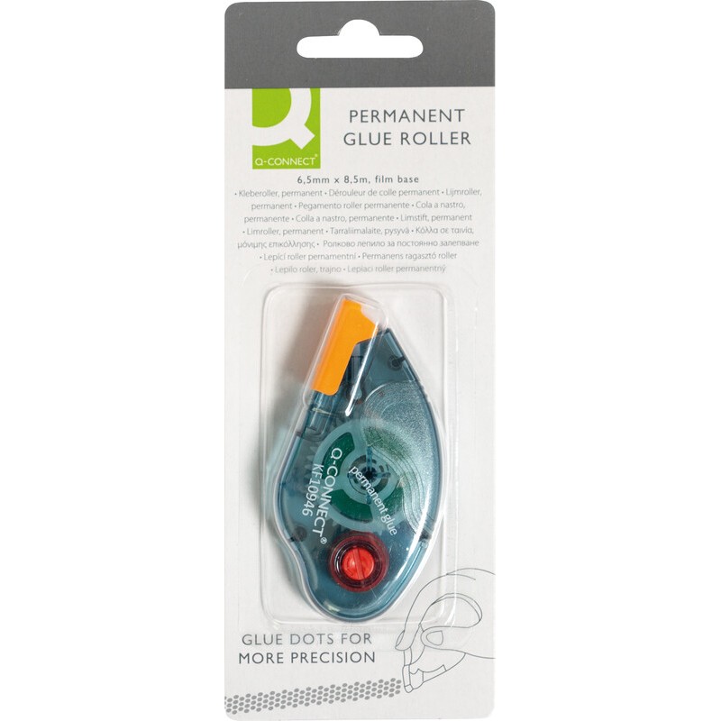 Dérouleur de colle Q-CONNECT®, colle permanente bande alvéolaire pour un collage propre et précis sur papier, carton, photos, matières synthétiques, verre, etc., sans solvant, dimensions de la bande: largeur 6,5 mm x longueur 8 m, non rechargeable. Durabilité eco:plus: emballage respectueux de l'environnement.
