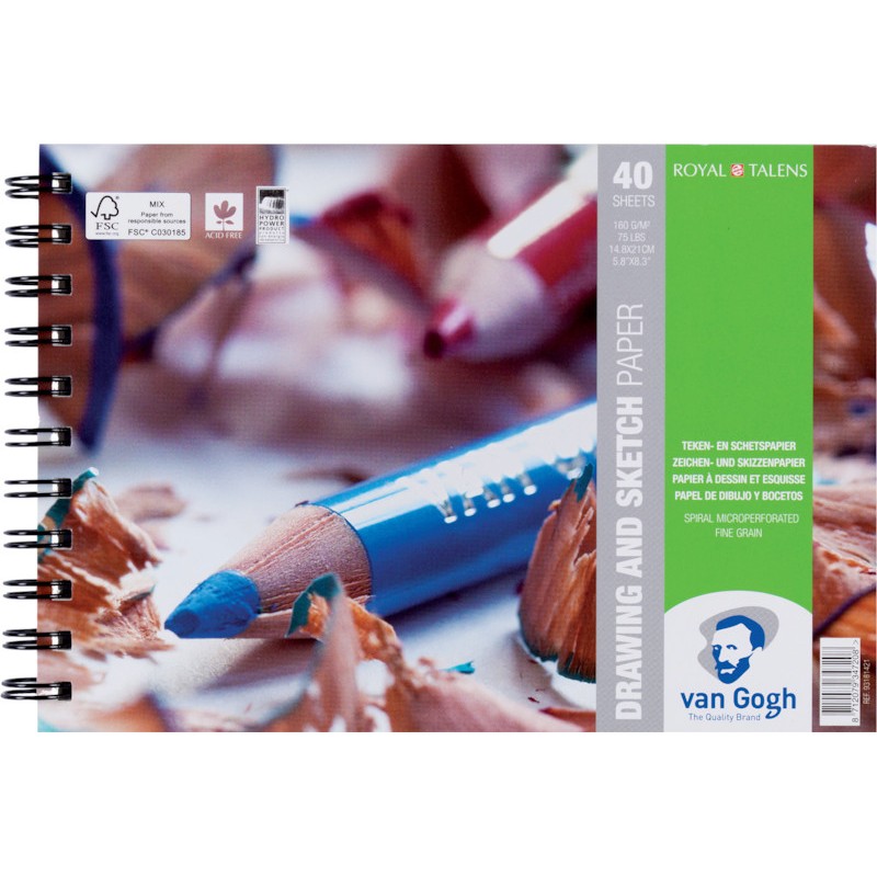 Bloc de papier à dessin VAN GOGH Drawing and Sketch papier à dessin blanc, 160 g/m2, au grain fin, adapté au dessin, crayon graphite, fusain, craie, pastels, crayons de couleur, encre et aquarelle, reliure spirale, 40 feuilles, perforé. Durabilité eco:plus: recyclable. Certification: FSC.