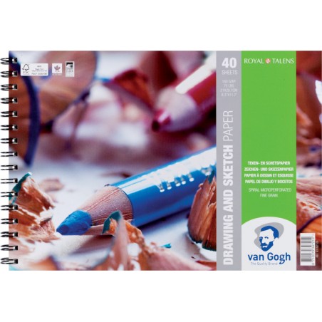 Bloc de papier à dessin VAN GOGH Drawing and Sketch papier à dessin blanc, 160 g/m2, au grain fin, adapté au dessin, crayon graphite, fusain, craie, pastels, crayons de couleur, encre et aquarelle, reliure spirale, 40 feuilles, perforé. Durabilité eco:plus: recyclable. Certification: FSC.