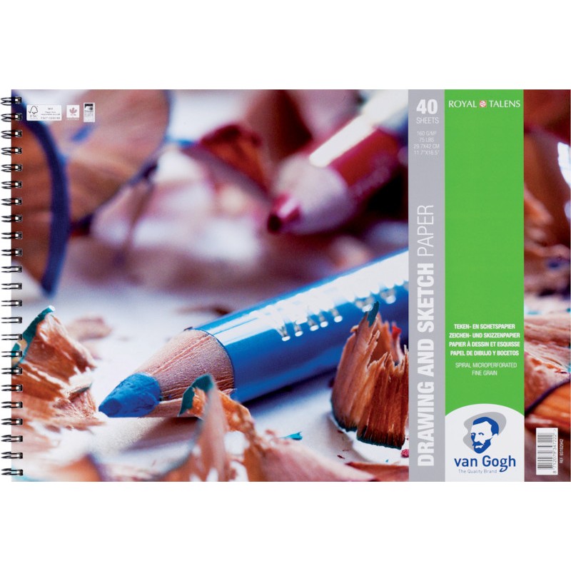 Bloc de papier à dessin VAN GOGH Drawing and Sketch papier à dessin blanc, 160 g/m2, au grain fin, adapté au dessin, crayon graphite, fusain, craie, pastels, crayons de couleur, encre et aquarelle, reliure spirale, 40 feuilles, perforé. Durabilité eco:plus: recyclable. Certification: FSC.