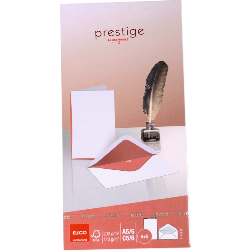 Cartes doubles avec enveloppes ELCO Prestige cartes doubles: en carton blanc, 200 g/m2, légèrement satiné, bord coloré sur deux côtés, enveloppes: en papier blanc 120 g/m2, impression intérieure en couleur, rabat triangulaire gommé, façon L. Cello-Zip de 5 sets. Durabilité eco:plus: recyclable. Certification: FSC.