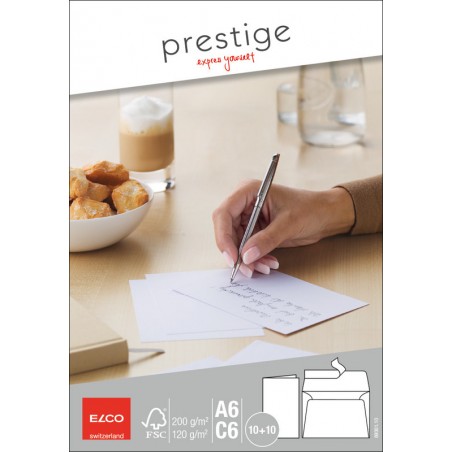 Cartes doubles avec enveloppes ELCO Prestige blanc en carton extra-blanc, 200 g/m2, satiné, en emballage transparent. Set de 10 pièces. Durabilité eco:plus: recyclable. Certification: FSC.