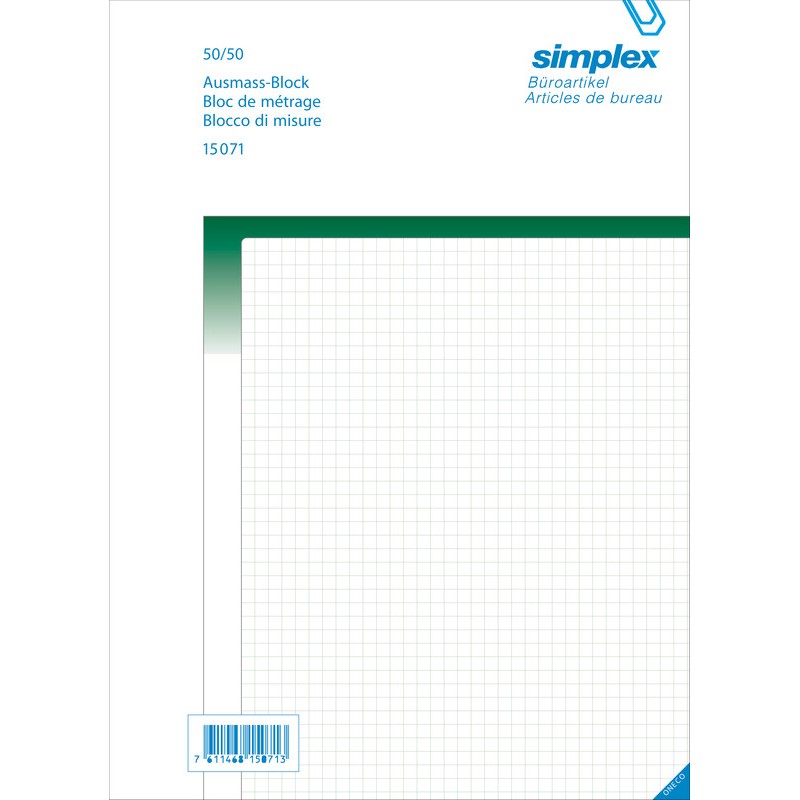 Bloc à duplicata SIMPLEX de métrage Oneco autocopiant, perforation 8 cm et coins découpés, numérotés consécutivement, reliure collée, couleur d'identification vert, 1re feuille vert, fixe, quadrillé 5 mm, 2e feuille blanche, perforée, neutre.