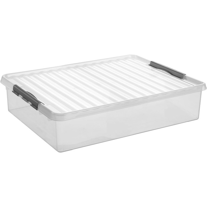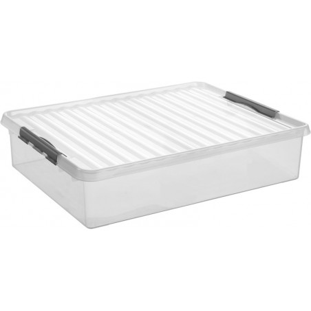 Boîte de rangement HELIT the q-line en PP transparent, couvercle clipsable, empilable. Durabilité eco:plus: durée de vie du produit prolongée, recyclable, teneur en déchets recyclés après utilisation max. 100%, réduction des déchets. sans poignée
