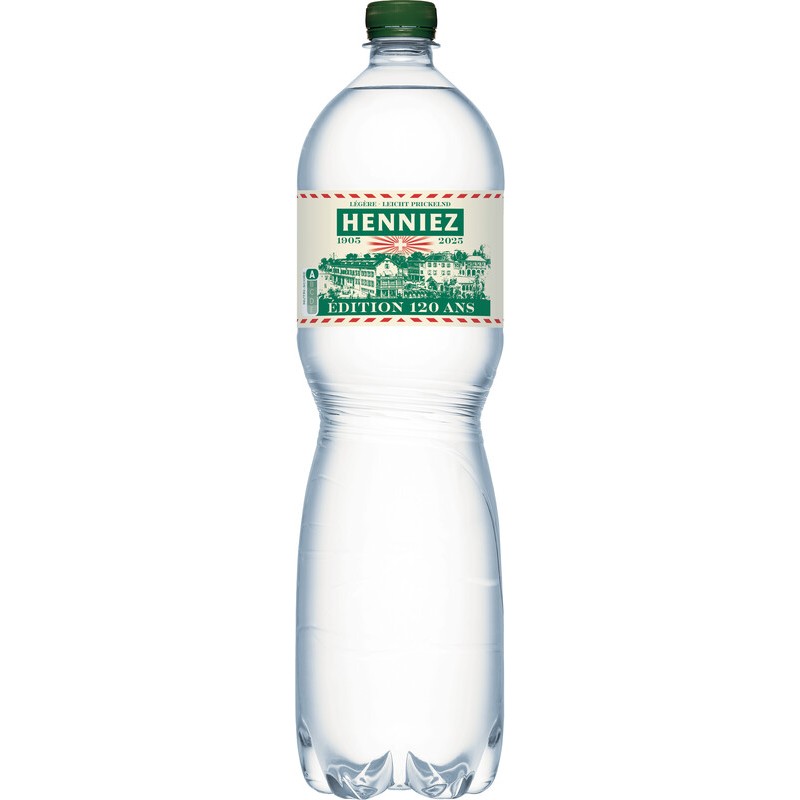 Eau minérale HENNIEZ® PET durabilité eco:plus: énergie récupérée, recyclable, composant recyclé, teneur en déchets recyclés avant utilisation max. 75%, teneur en déchets recyclés après utilisation max. 100%, réduction des déchets, emballage respectueux de l'environnement. bouteille de 1,5 l